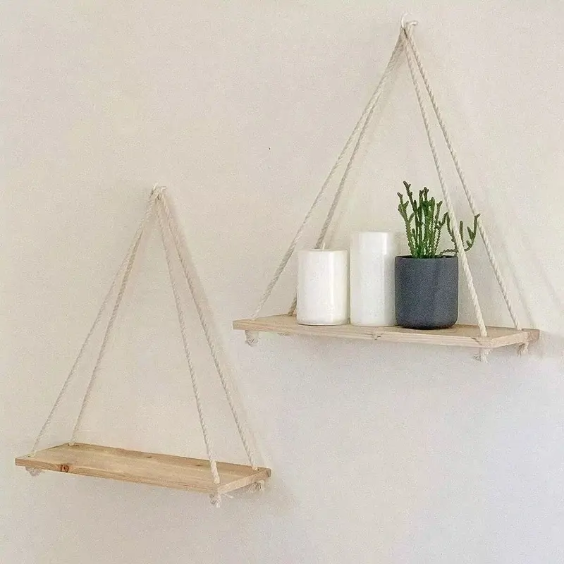 الصفحة الرئيسية اثاث رف خشبي معلّق بحبل قنب